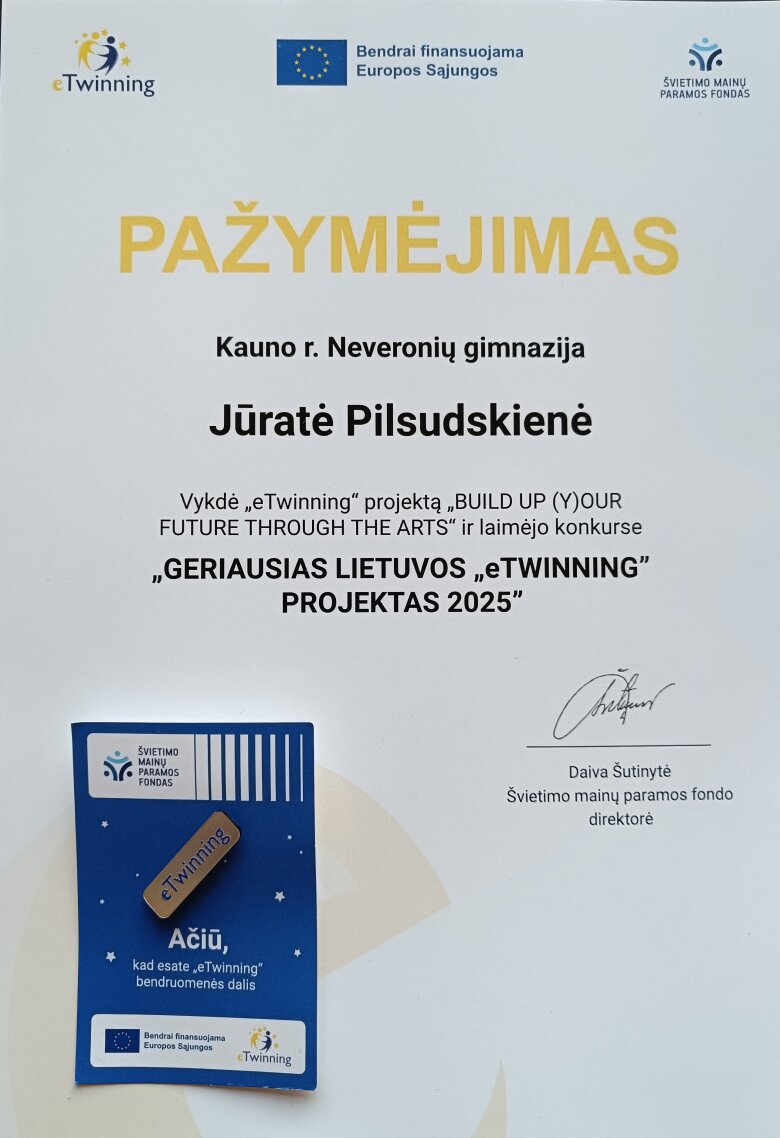 Neveronių gimnazijos bendruomenė, vadovaujama anglų kalbos mokytojos Jūratės Pilsudskienės vykdė "eTwinning" projektą "BUILD UP(Y)OUR FUTURE THROUGH THE ARTS" ir laimėjo konkurse "GERIAUSIAS LIETUVOS "e.TWINNING" PROJEKTAS 2025". Džiaugiamės ir linkime sėkmės tarptautiniuose projektuose įvairinant ugdymo procesą.