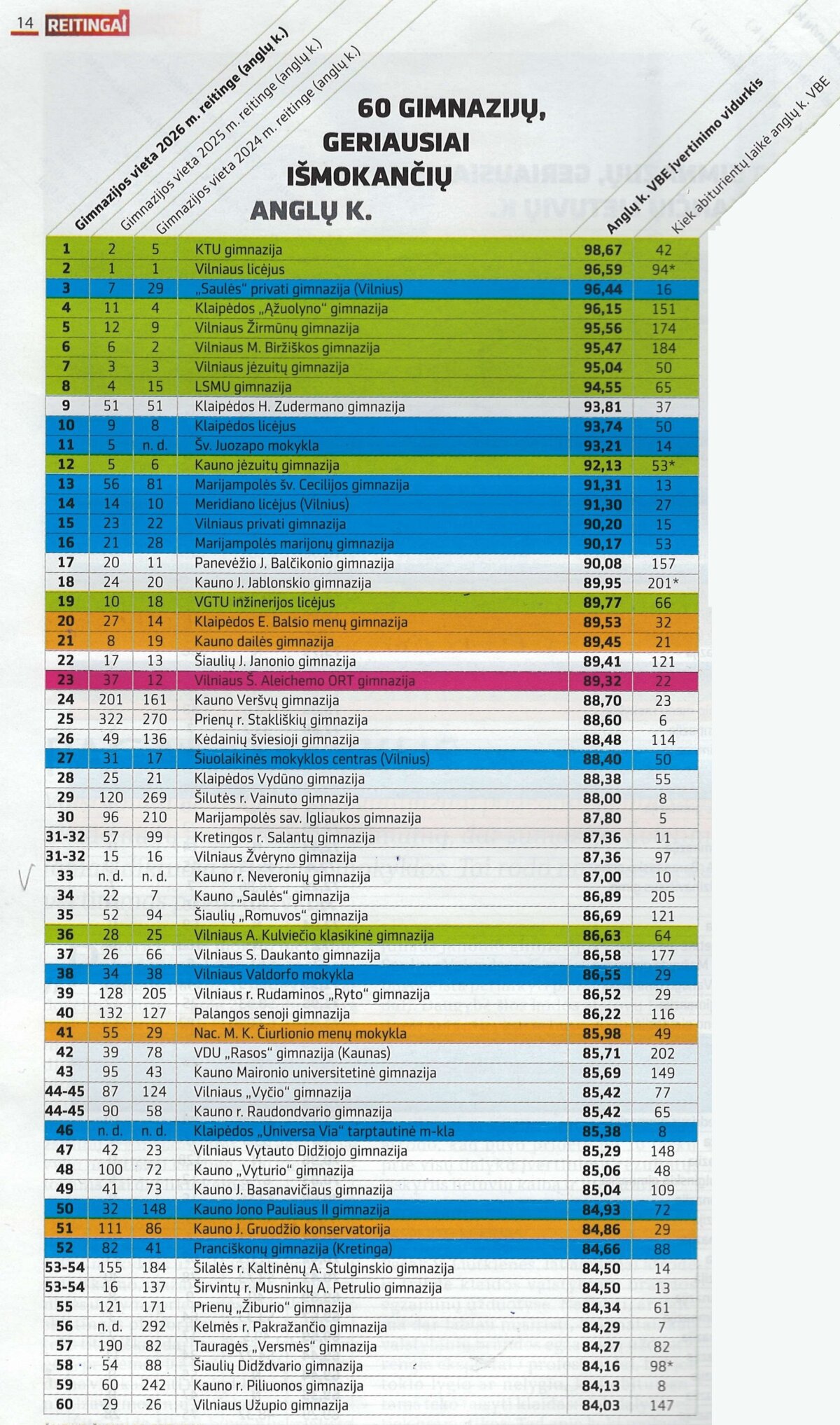 Anglų kalbos reitinge mūsų gimnazija – 33-ioje vietoje. Tai rodo, kad mūsų abiturientai anglų kalbos egzaminą laiko sėkmingai ir pasiekia aukštesnius nei vidutiniai rezultatus. Šis pasiekimas patvirtina anglų kalbos mokymo kokybę, atspindi mokytojų ir mokinių įdirbį, sistemingą pasiruošimą egzaminui.
