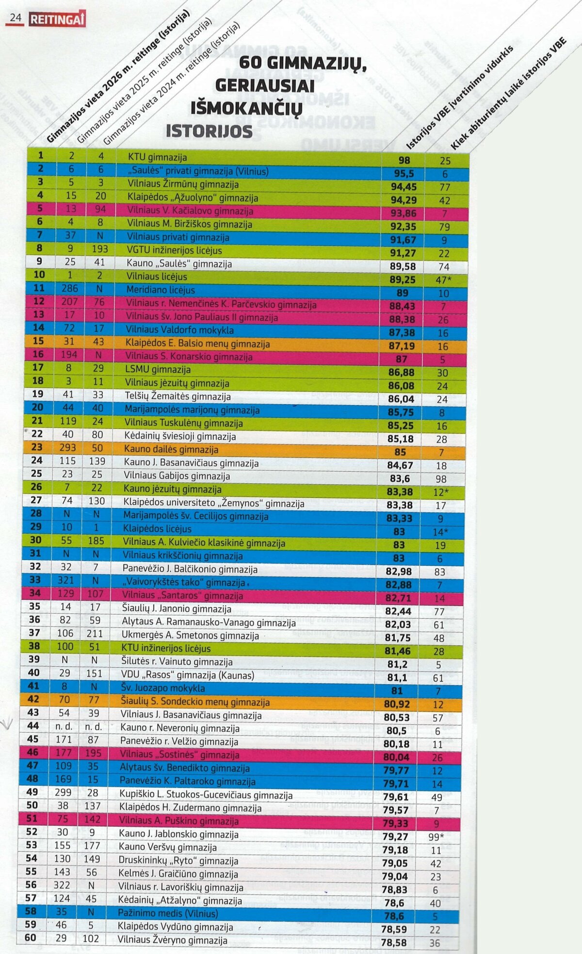 Žurnalas „Reitingai“ kasmet sudaro gimnazijų reitingus pagal valstybinių brandos egzaminų (VBE) rezultatus. Dalykiniuose reitinguose yra ne tik bendri gimnazijų pasiekimai, bet ir atitinkami reitingai pagal atskirus dalykus – lietuvių k., matematikos, istorijos, informatikos, anglų k. ir kt. Į šiuos dalykinius reitingus patenka 60-ties geriausiai to dalyko egzaminus išlaikiusių gimnazijų sąrašas.