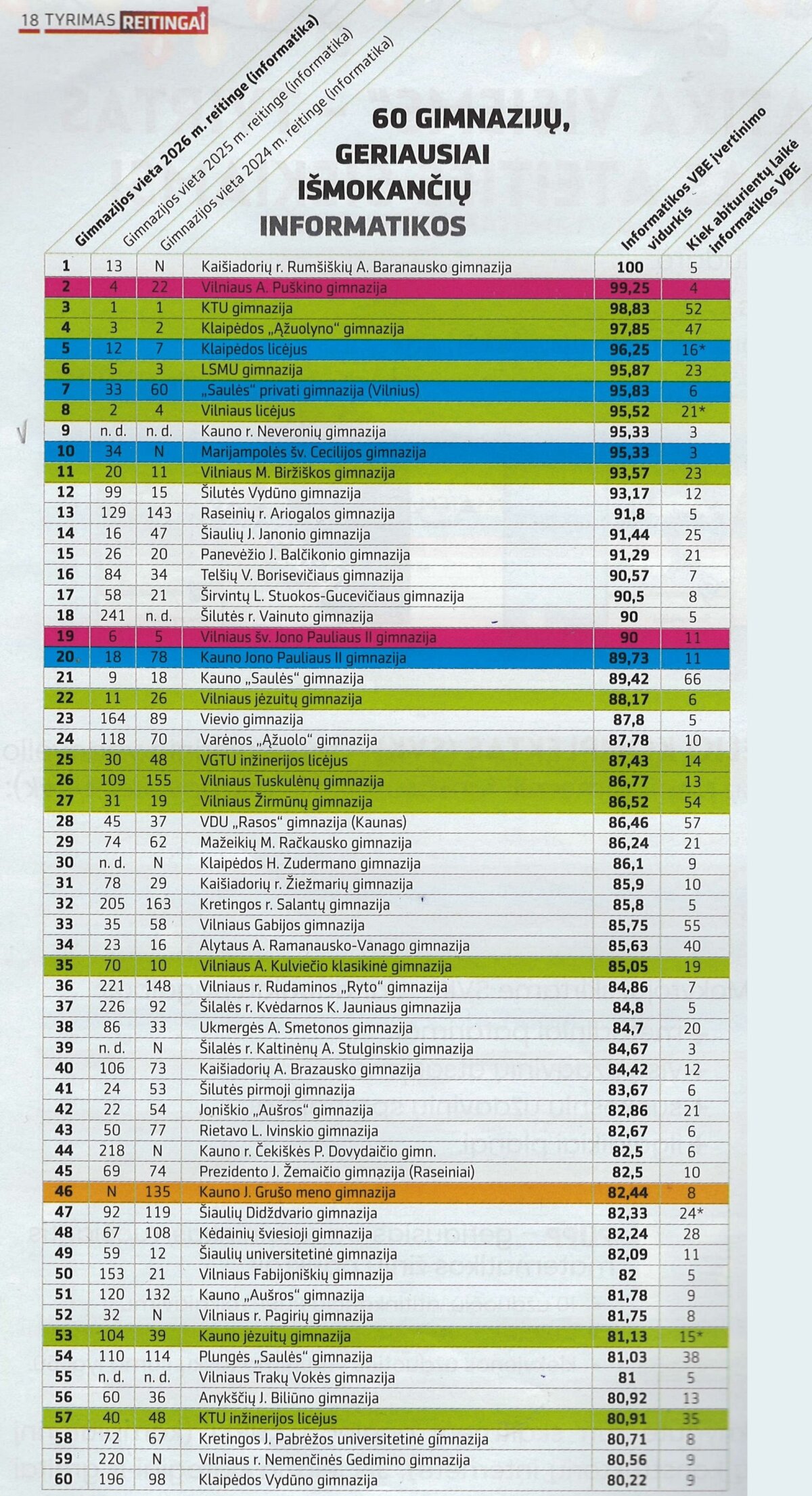 Šiemet Kauno r. Neveronių gimnazija, pagal 2024–2025 m. m. VBE egzaminų rezultatus, figūruoja net 3 reitingų pozicijose. Ypač didžiuojamės užimta 9-ąja vieta tarp 60-ies geriausiai informatiką išmokančių Lietuvos gimnazijų. Tai – puikus pasiekimas šalies mastu! 9-a vieta reiškia, kad mūsų gimnazijos abiturientai yra vieni iš stipriausių šalies informatikos egzamino sprendėjų. Aukštas akademinis lygis IT srityje parodo, kad gimnazija sistemingai ruošia mokinius ne tik bendram mokymui, bet ir labai konkrečiai – informatikos egzaminui, kuris reikalauja ir loginio mąstymo, ir technologinių žinių.